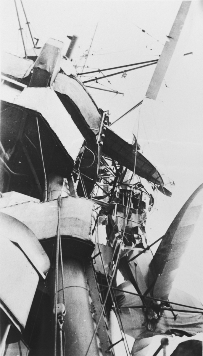 Flygplan S 5C har kolliderat med pansarfartyget Gustav V under mörkläggningsövning i Karlskrona den 10 mars 1939. Vy underifrån.