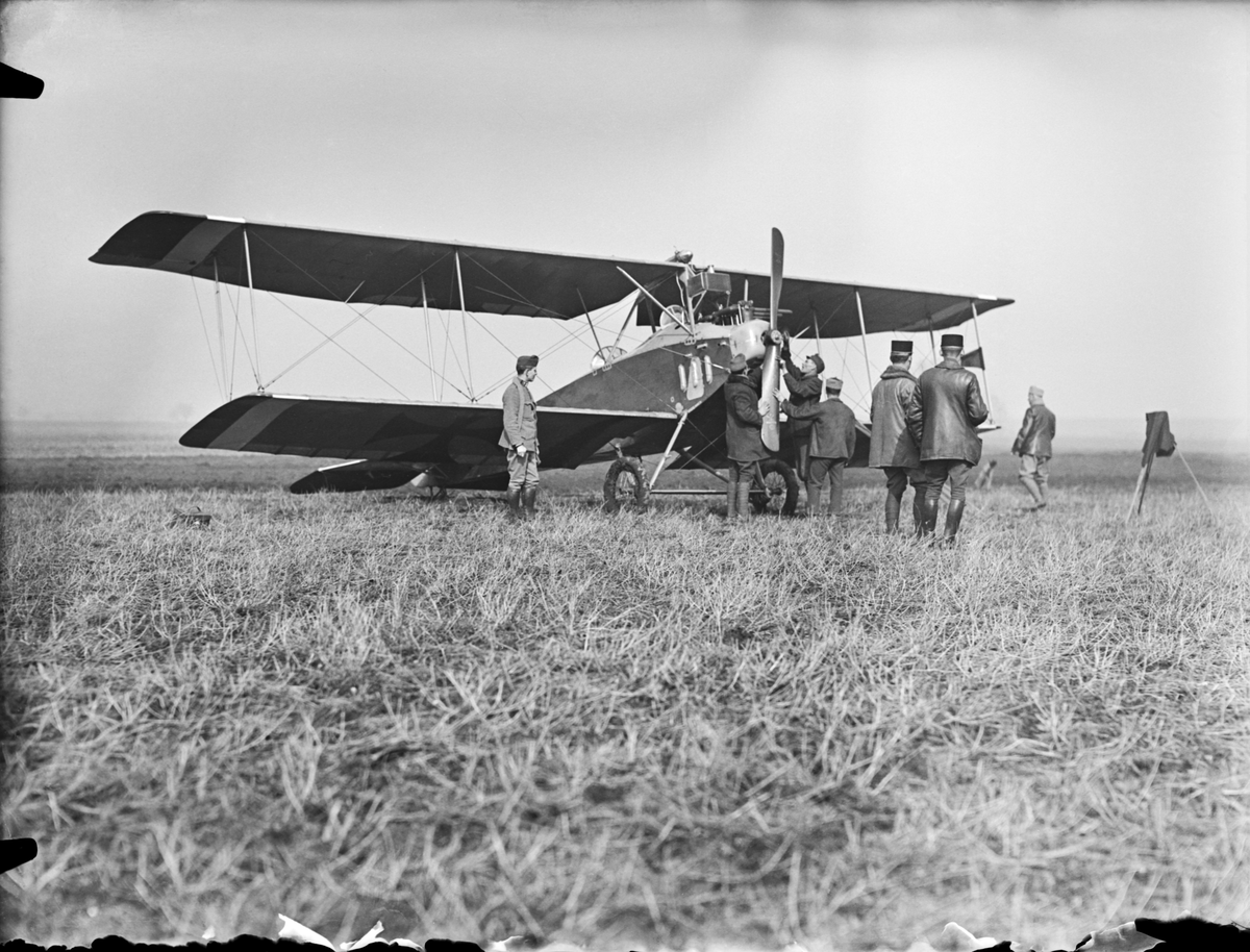 Militärer i arbete vid propeller på flygplan Albatros B.I tillhörande Österrike-Ungern. Vy snett framifrån.