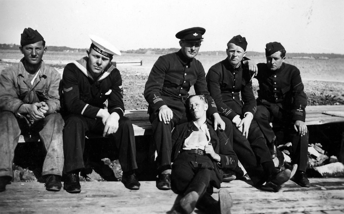 Fem militärer vilar på en brygga. Män från flygvapnet och marinen. 1930-tal.