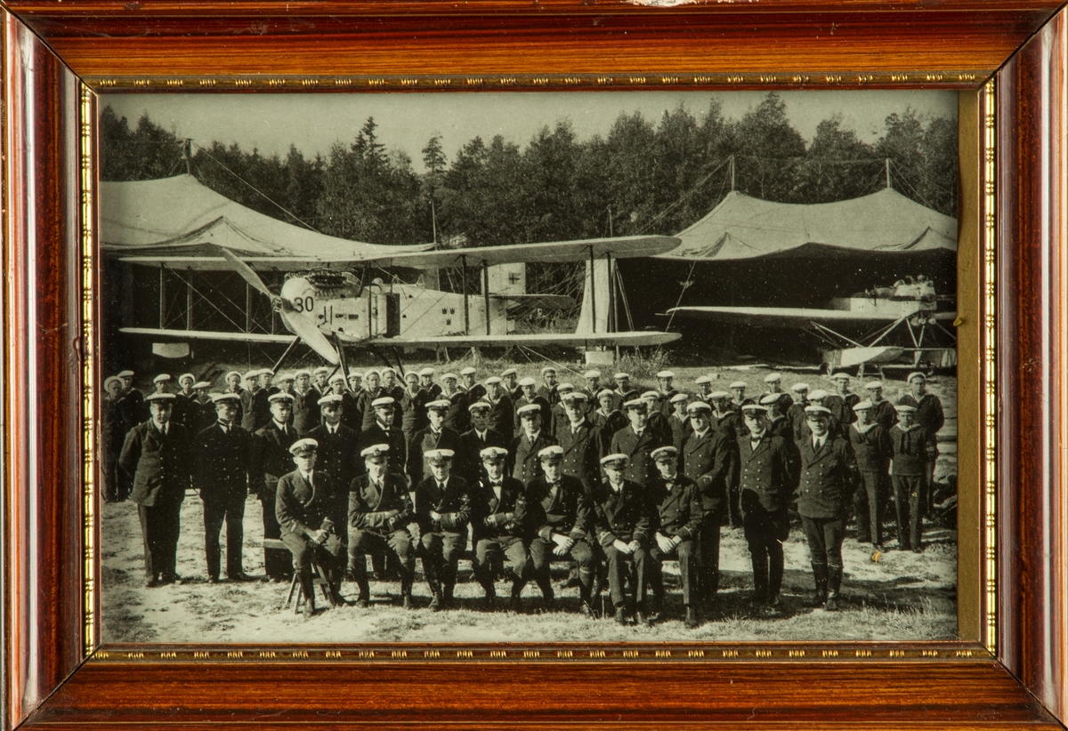 Gruppfotografi. Marinpersonal samlade framför två marina flygplan vid kustflottans flygstation vid Hårsfjärden år 1924. Inramat foto.