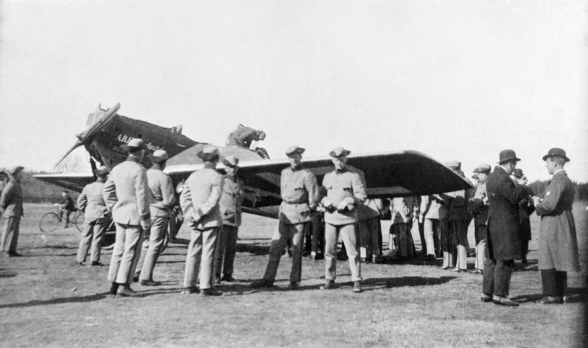 En folksamling står vid flygplan Junkers A 20 demonstrationsflygplan tillhörande AB Flygindustri på flygfältet på Malmen 1926.