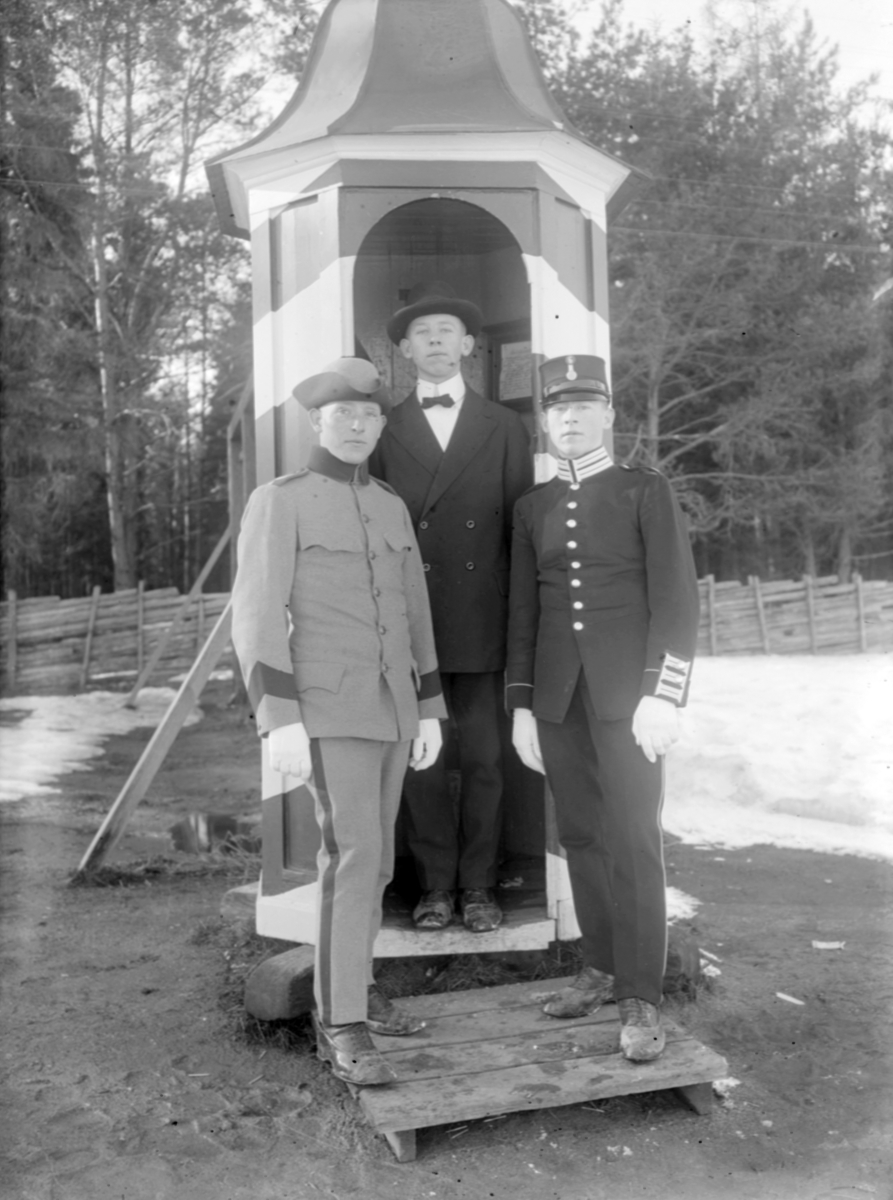 Grupporträtt. Tre män, varav två armésoldater från I 4 och / eller I 5 regemente står vid en vaktkur på Malmens lägerområde. Männen är bröder, från vänster syns Henning Axfors, Melker Axfors och Ernst Axfors.