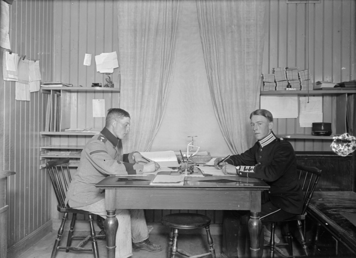 Porträtt. Två armésoldater från I 4 och / eller I 5 regemente sitter vid ett skrivbord. Männen är bröder och heter Henning Axfors (till vänster) och Ernst Axfors (till höger).