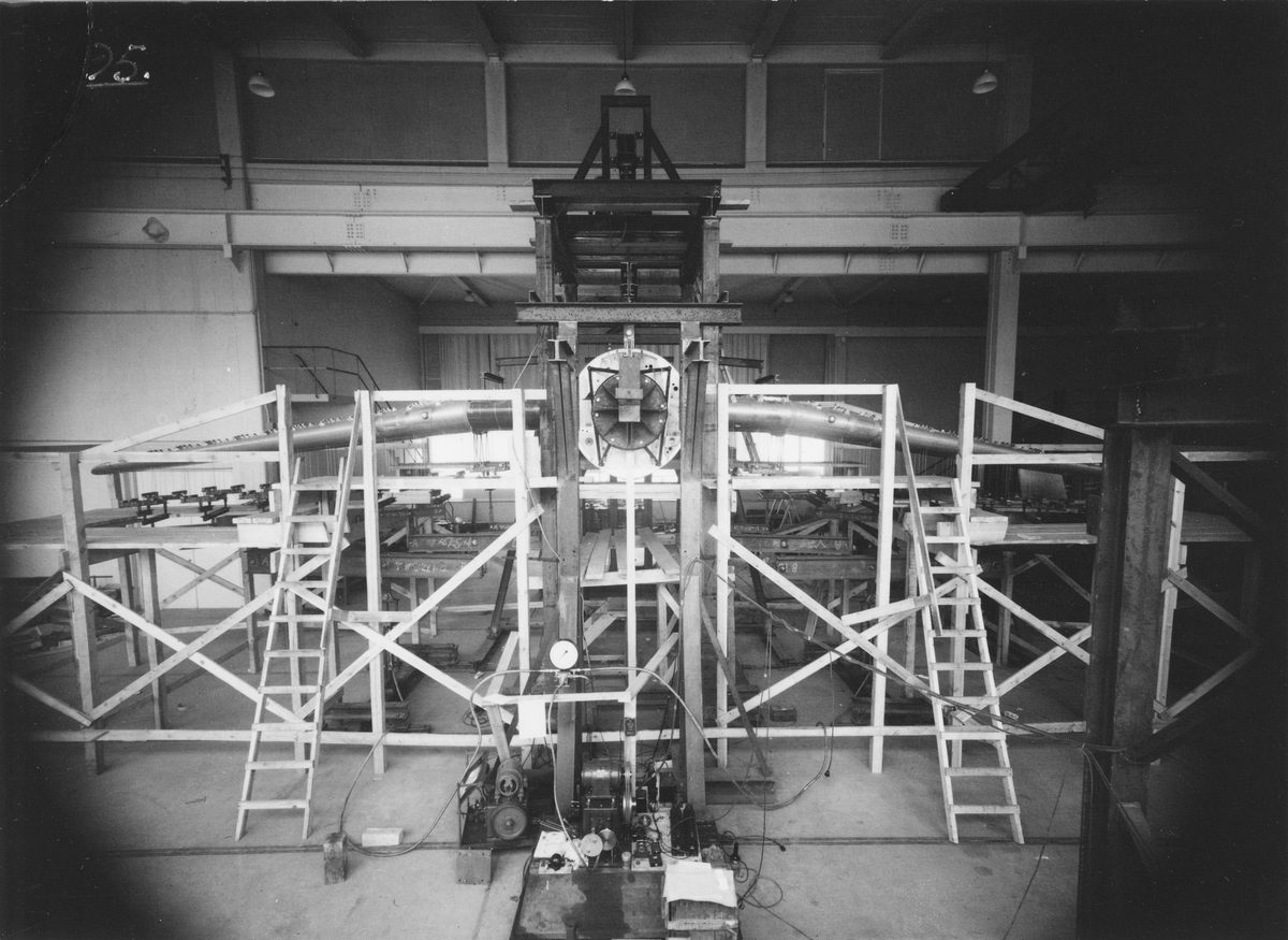 Hållfasthetsprov av vingar på flygplan Saab B 17 på Flygtekniska försöksanstalten, 1940-tal. Vy framifrån.