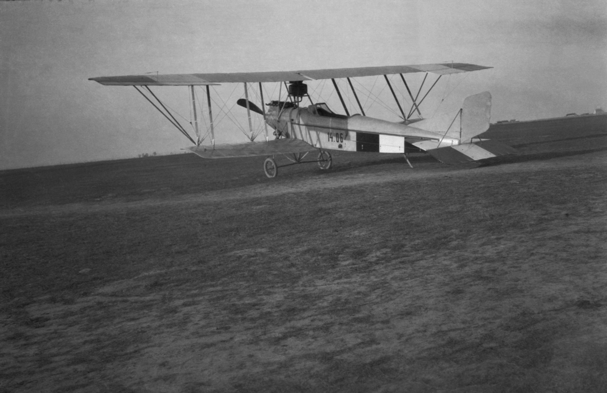 Militärt flygplan Lohner B.III märkt nr 14.06 tillhörande Österrike-Ungern står på ett flygfält. Vy bakifrån.