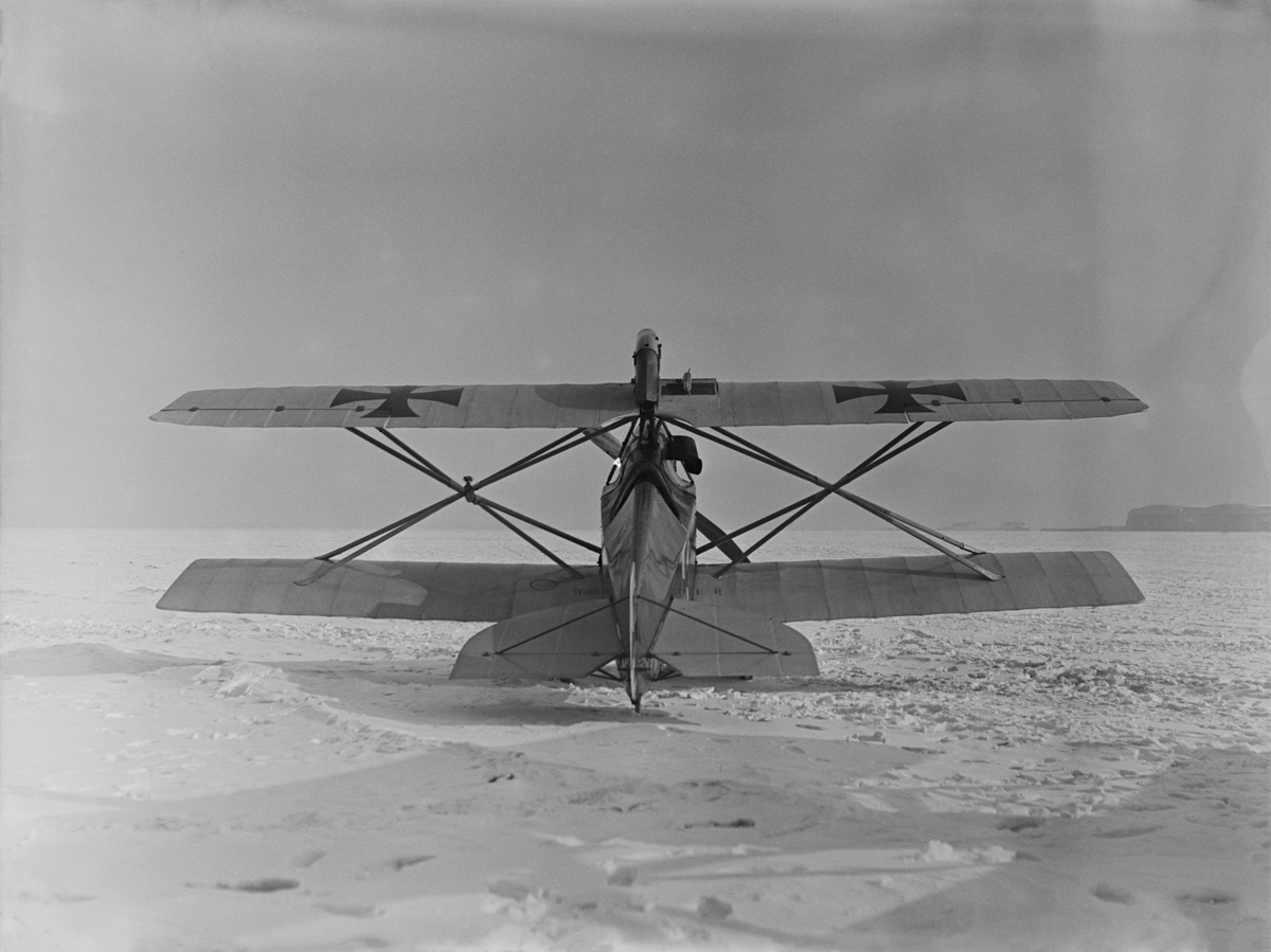 Militärt flygplan Hansa Brandenburg D.I märkt 28.12 tillhörande Österrike-Ungern uppställt på flygfält, vintertid. Vy bakifrån.