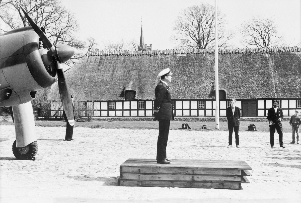 Överlämningsceremoni för flygplan B 17A, förut nummer 17320/SE-BWC, till Egeskov museum, Danmark den 5 maj 1970. Vid flygplanet syns den svenske flygvapenchefen Stig Norén.