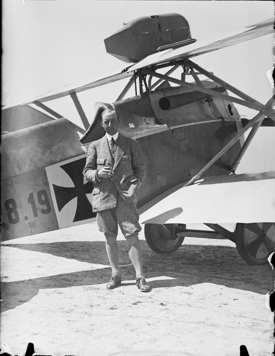 Edmund Sparmann står vid militärt flygplan Hansa Brandenburg D.I märkt 28.19 tillhörande Österrike-Ungern. Vy från sidan.