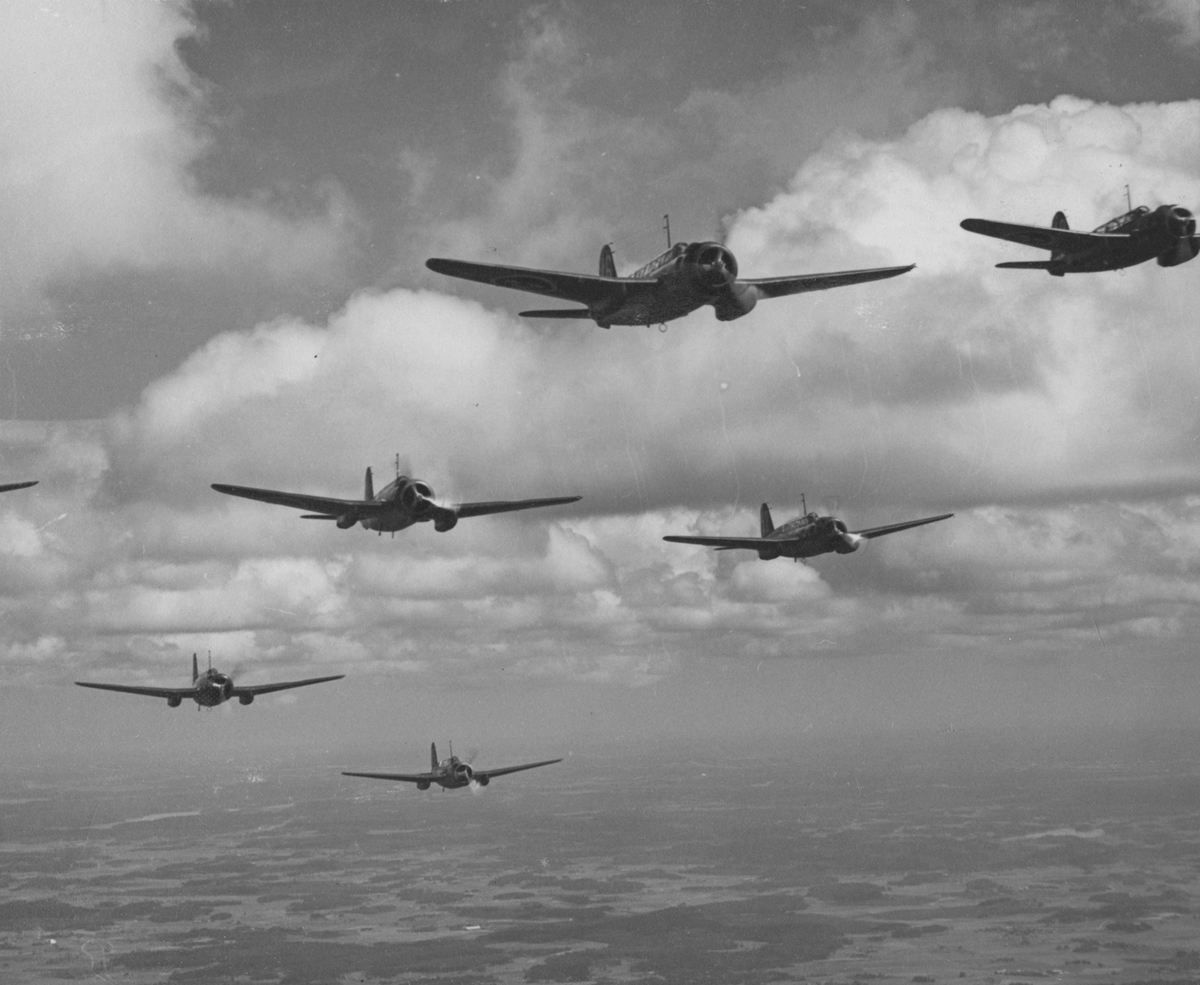 Sju stycken flygplan S 17 i formationsflygning i luften.