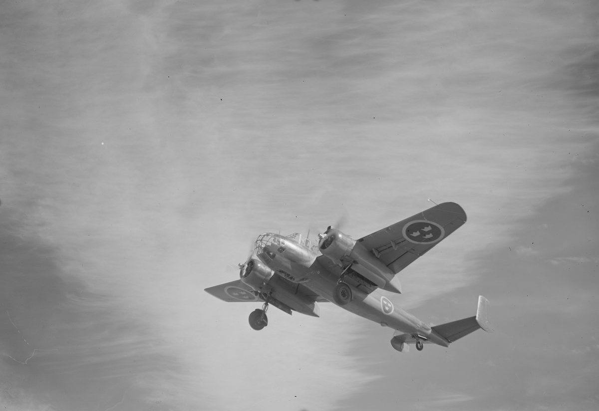Flygplan B 18A i luften, sett nedifrån. Flygplan endast märkt med nationalitetsbeteckning.