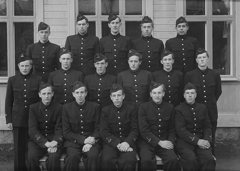 Elever vid vicekorpralskolan på F 3 Östgöta flygflottilj, 1944-1945. Del av klass, 16 elever. Grupporträtt framför byggnad.