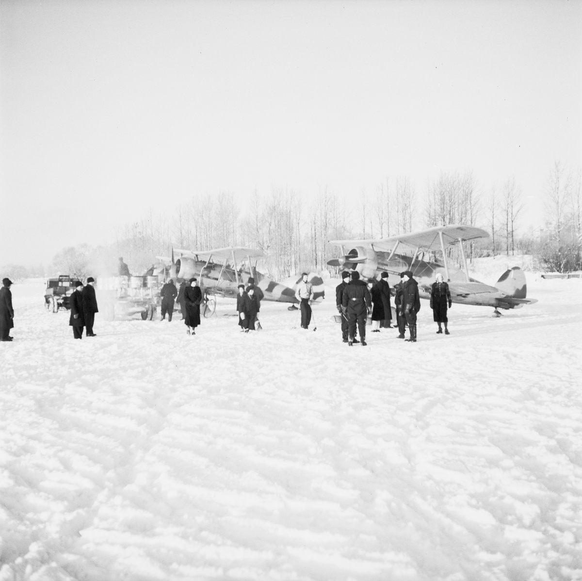 Militärer och Ljusdalsbor samlade på flygfältet på Kyrksjöns is i Ljusdal den 1 januari 1940. I bakgrunden står två flygplan Gloster Gladiator. Flygplanen flög senare vidare till Svenska frivilligkåren i Finland, F 19.