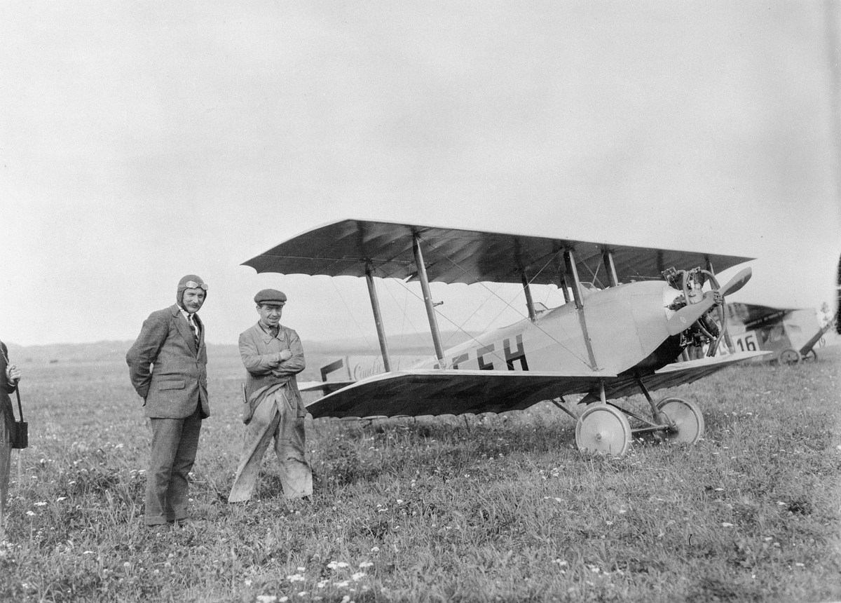 Franskt flygplan Caudron C 68 märkt F-AFFH uppställt på Internationella luftfartsutställningen i Göteborg (ILUG), 1923. Två män vid planet.