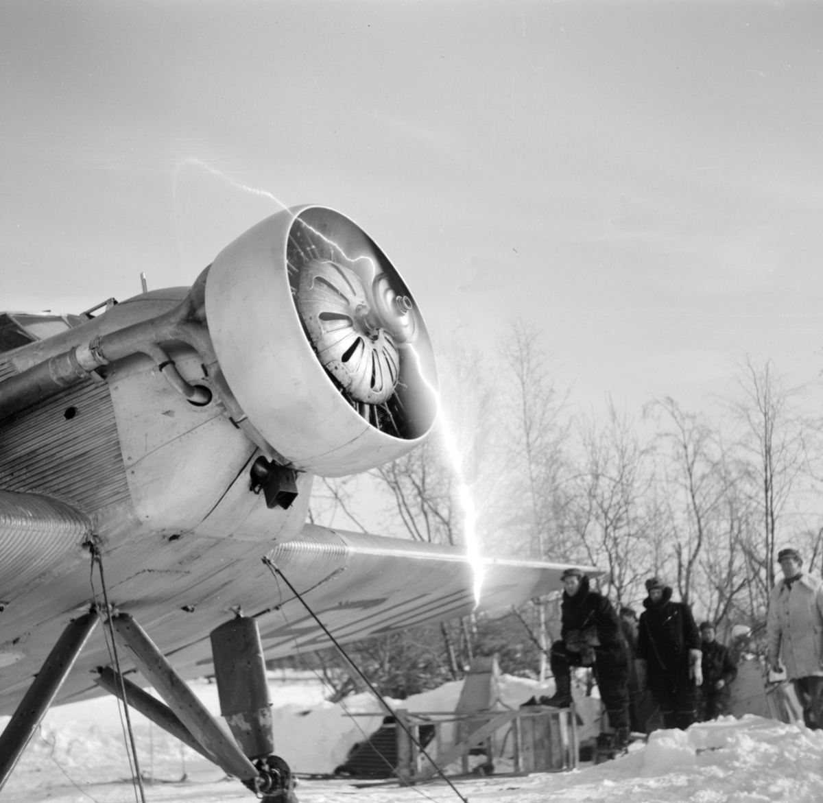 Varmkörning av motor på flygplan Junkers F-13 vid F 19, Svenska frivilligkåren i Finland. En grupp militärer står vid sidan om flygplanet.
