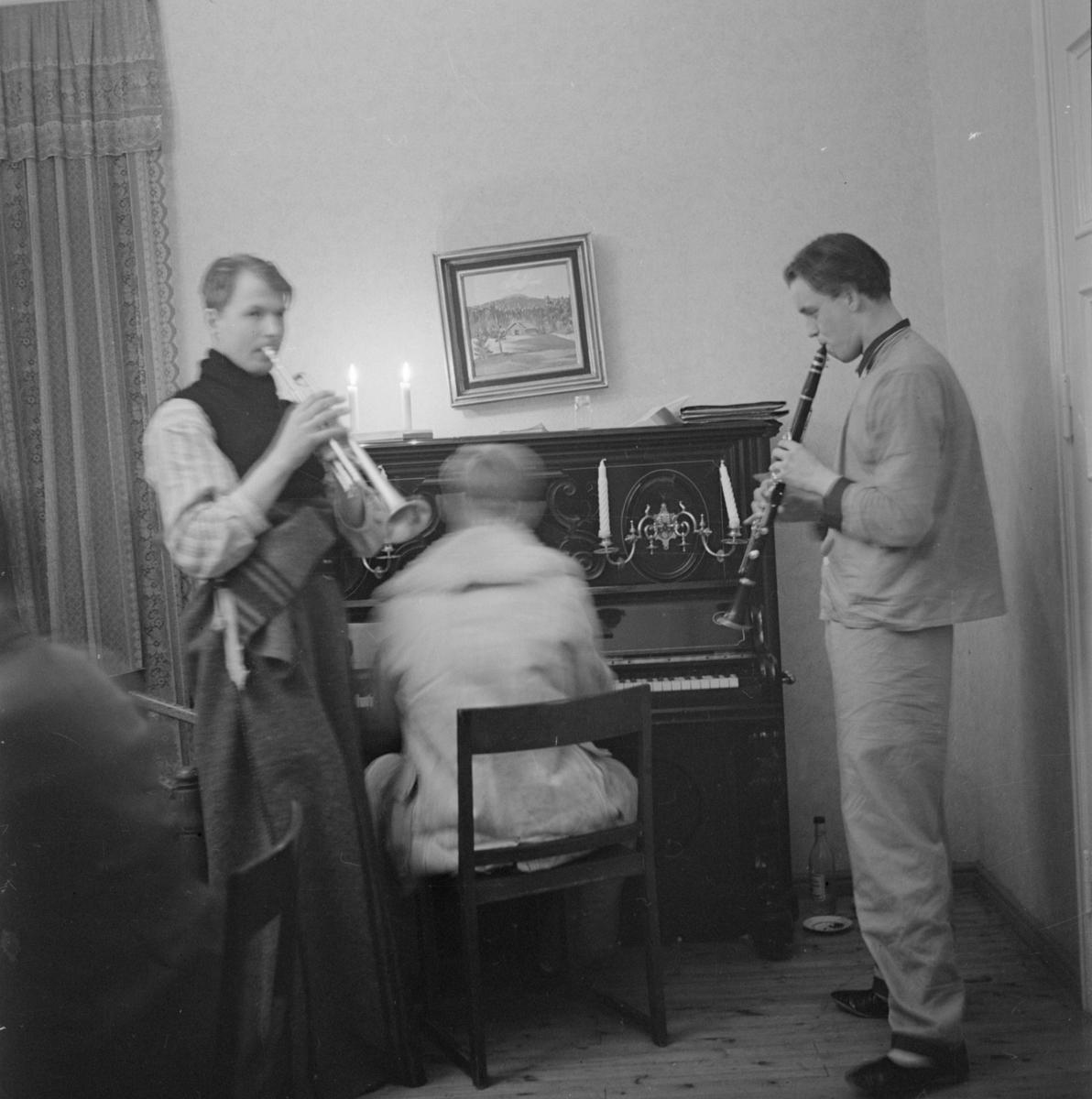 Musicerande i mässen vid F 19, Svenska frivilligkåren i Finland. En pianist och två blåsarmusiker.