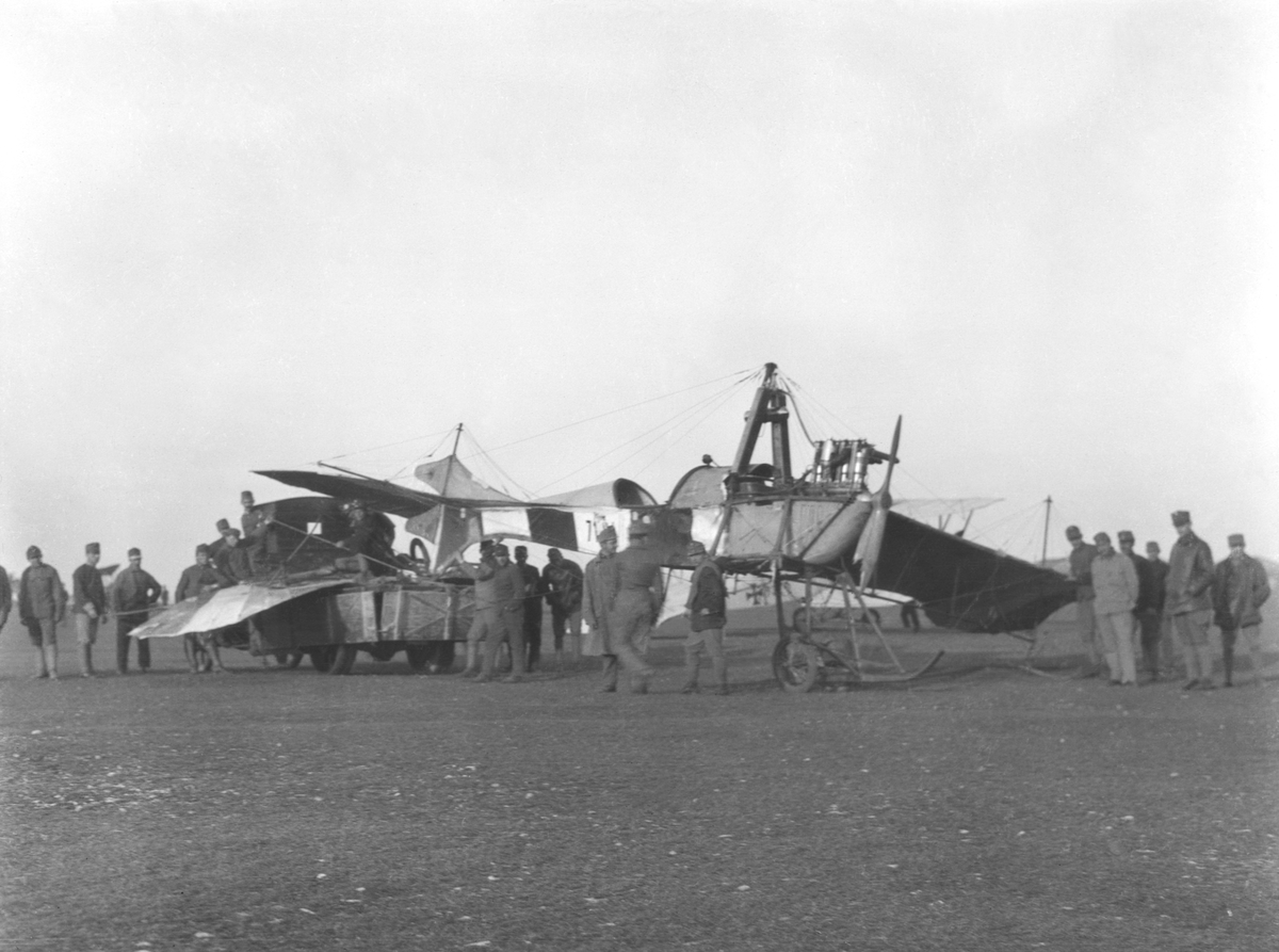 Havererat militärt flygplan Etrich Taube A.I tillhörande Österrike-Ungern lastas på lastbil för att flyttas. Militärer vid flygplanet. Vy från sidan.