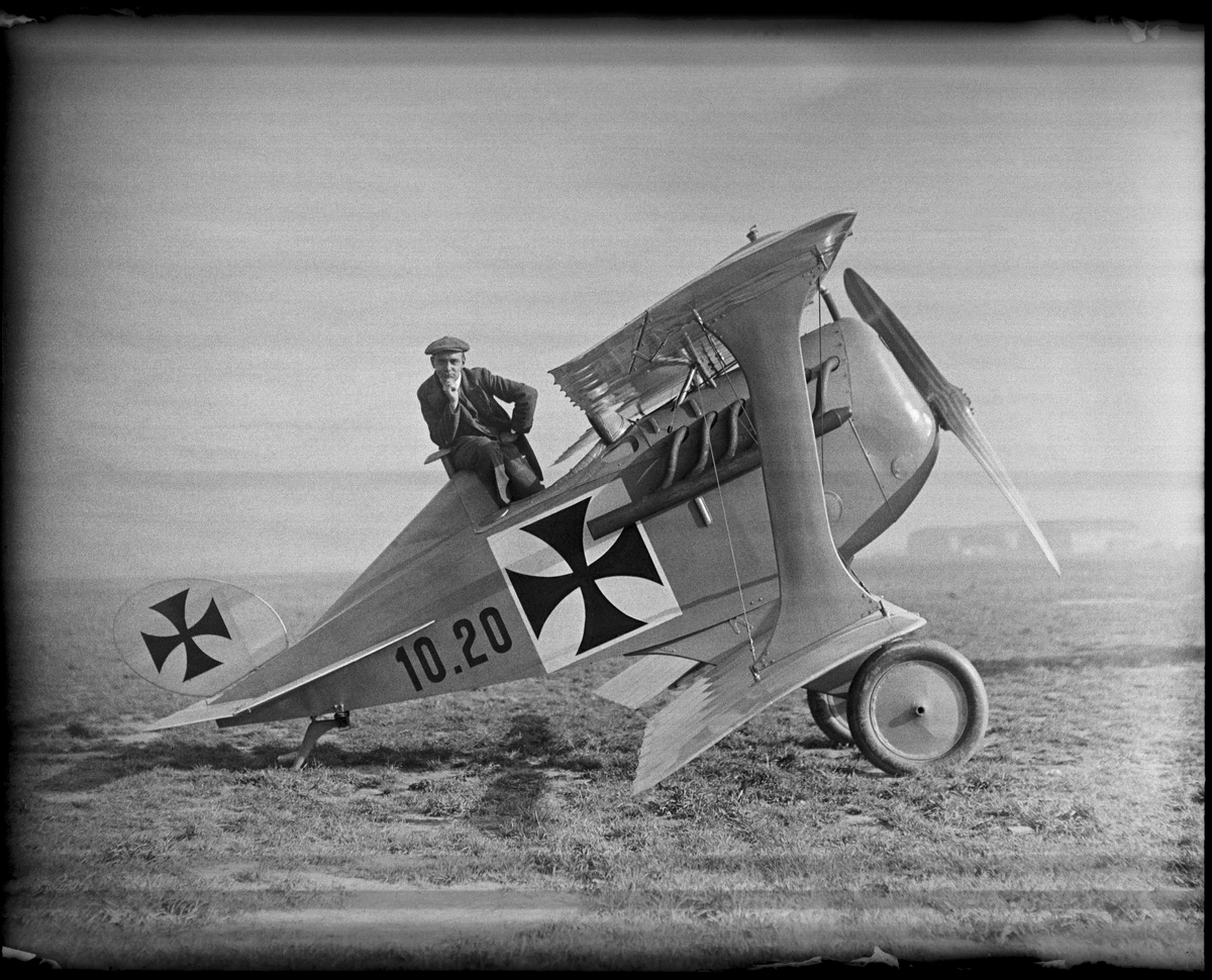 Militärt prototypflygplan Lohner D.I märkt 10.20 står på ett flygfält. En man sitter på flygplanet. Byggnader i bakgrunden. Vy från sidan.