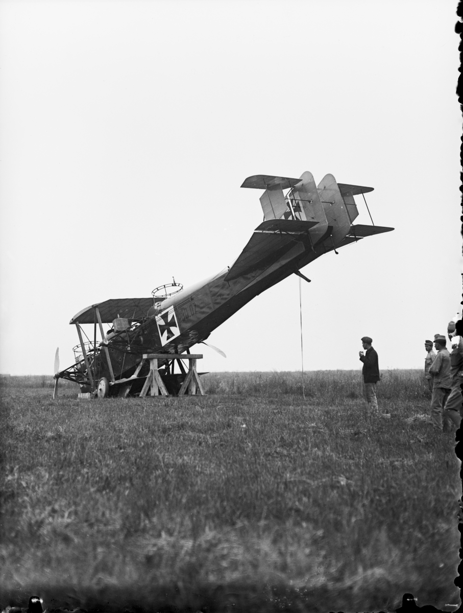 Militärt flygplan Aviatik märkt 30.07 tillhörande Österrike-Ungern står nosen på ett flygfält. Militärer vid flygplanet. Vy snett bakifrån.