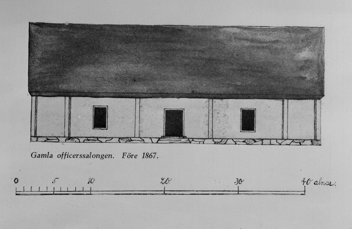 Skiss av gamla officerssalongen på Malmen, före 1867. Avfotografering av bild ur tryck.