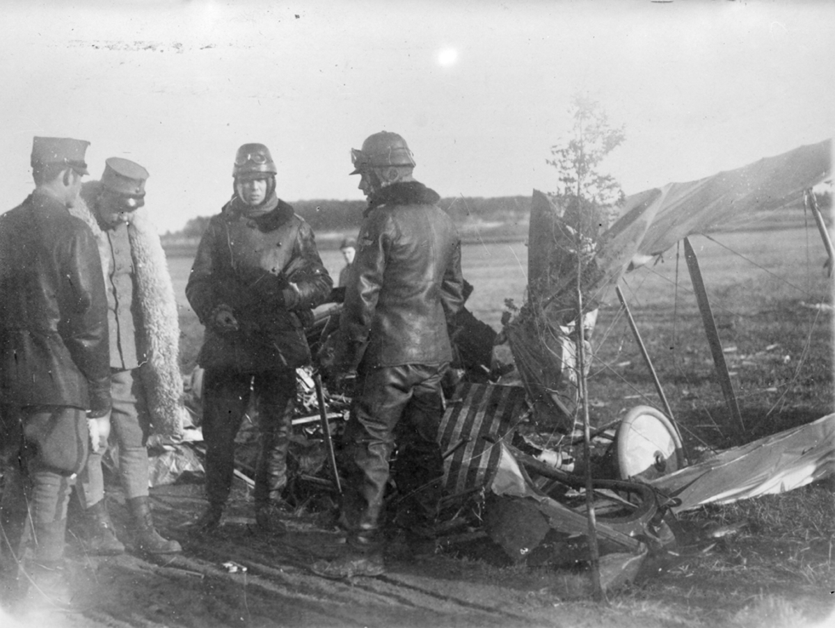 Fyra män kring ett havererat flygplan Albatros SW 12 nummer 618 ur Flygkompaniet vid Espetorp, Lambohov, 5 februari 1920.