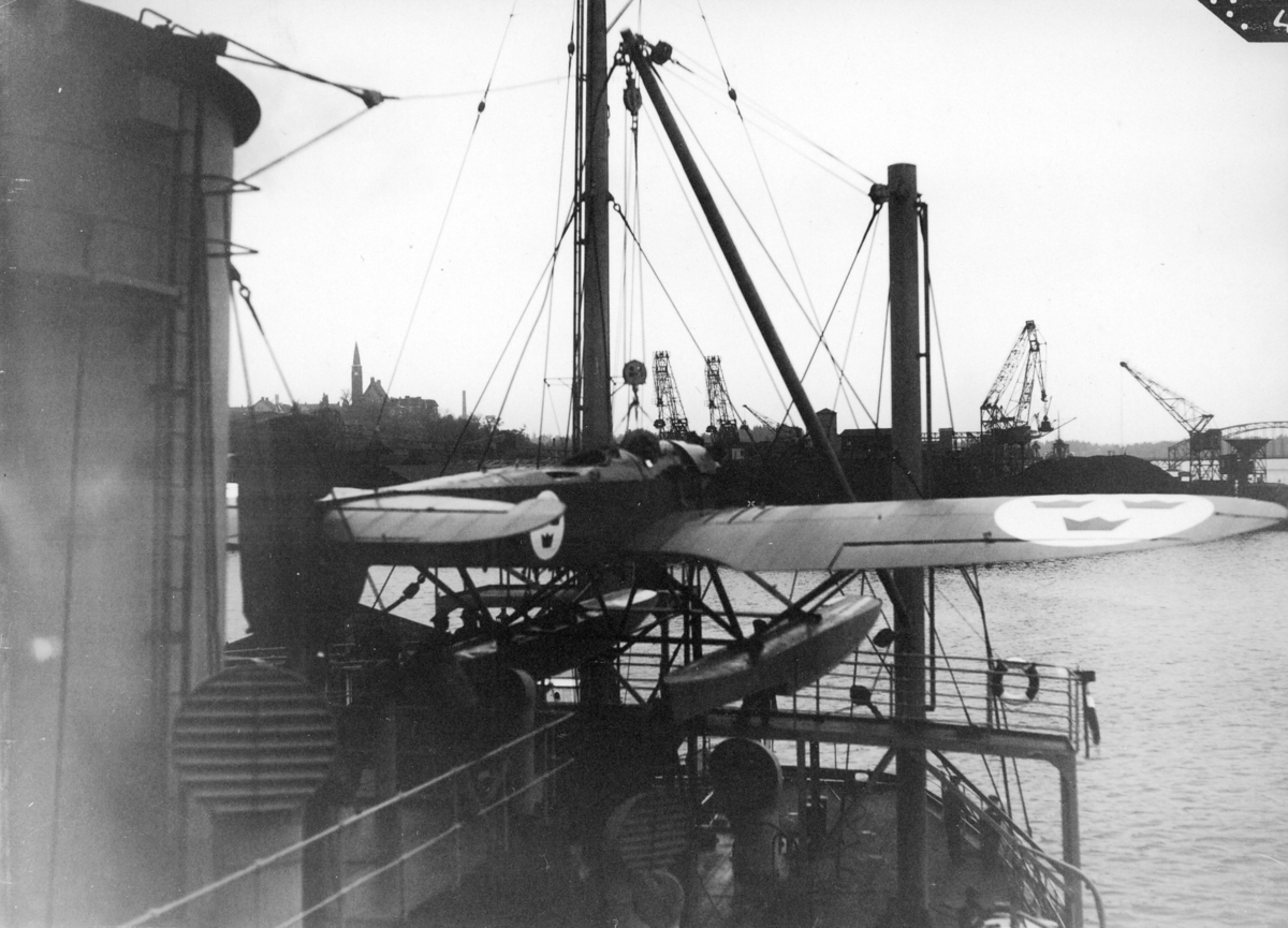 Flygplan S 5 lyfts med kran till ett fartygsdäck. Flygplanet på fartygsdäck.