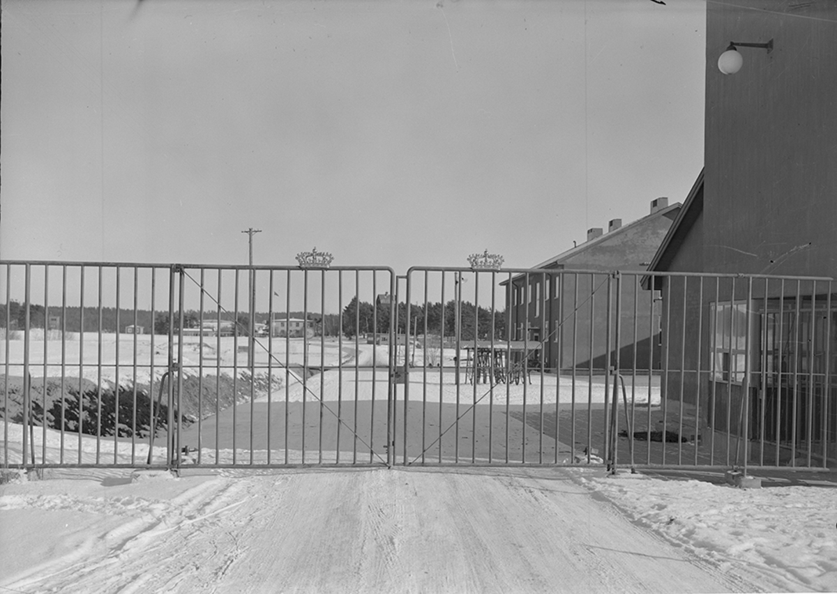 Vaktingång till F 2 flygflottilj. Grindarna stängda. Vintertid.