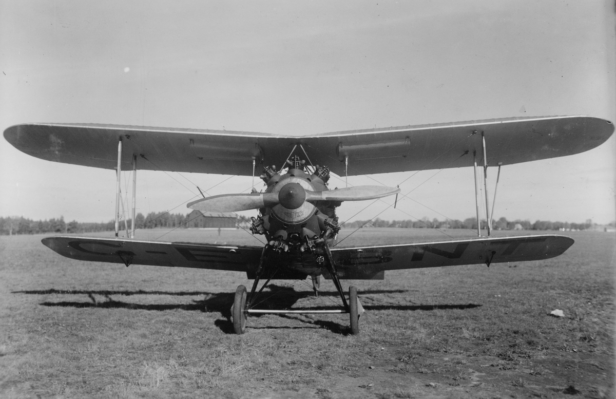 Brittiskt flygplan Gloster Gamecock med registrering G-EBNT på flygfältet på Malmen omkring 1925. Vy framifrån.