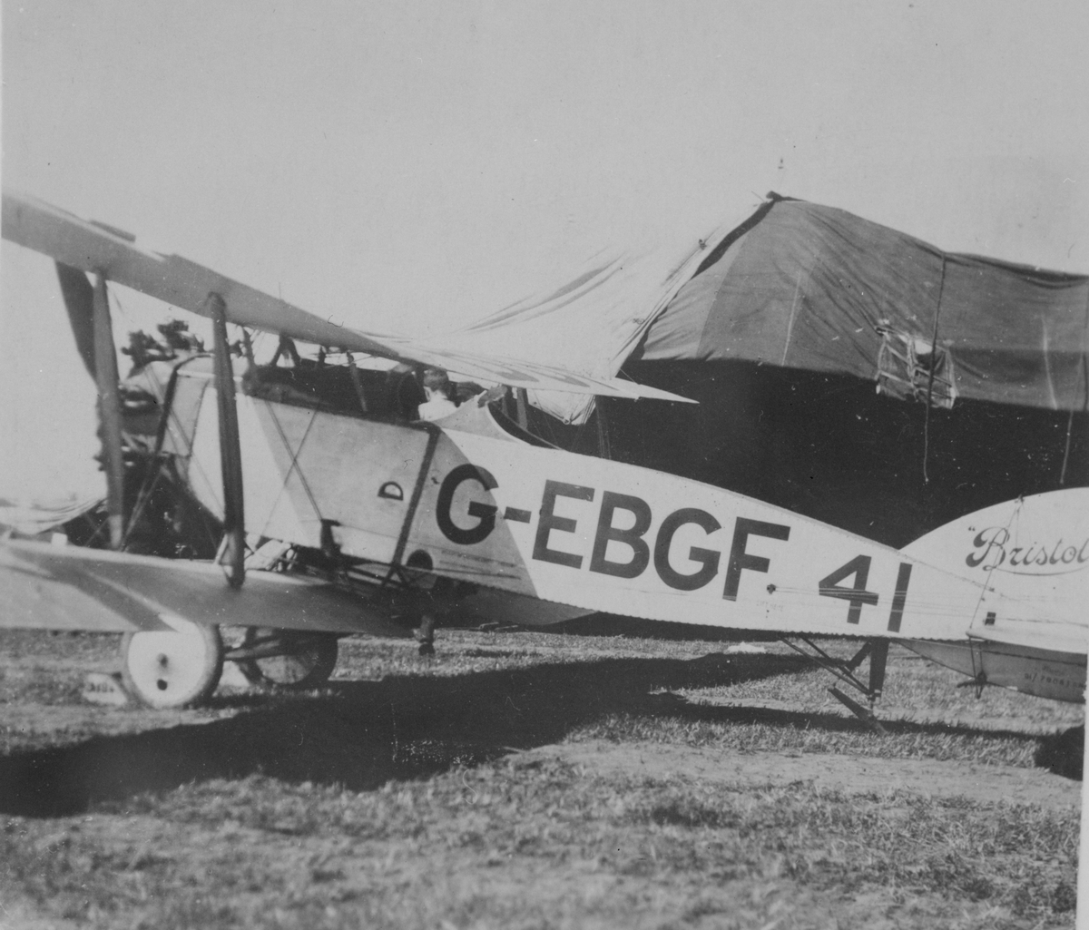 Flygplan Bristol 76 Jupiter Fighter med engelsk civilregistrering G-EBGF 41 från sidan. På Internationella luftfartsutställningen i Göteborg, 1923 (ILUG).
