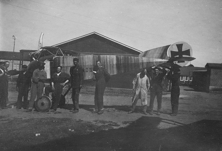 Flygplan Fokker D. IV tillhörande Flygkompaniet, men med tysk märkning, framför hangarer på Malmen. Flygplanstekniker vid flygplanet.