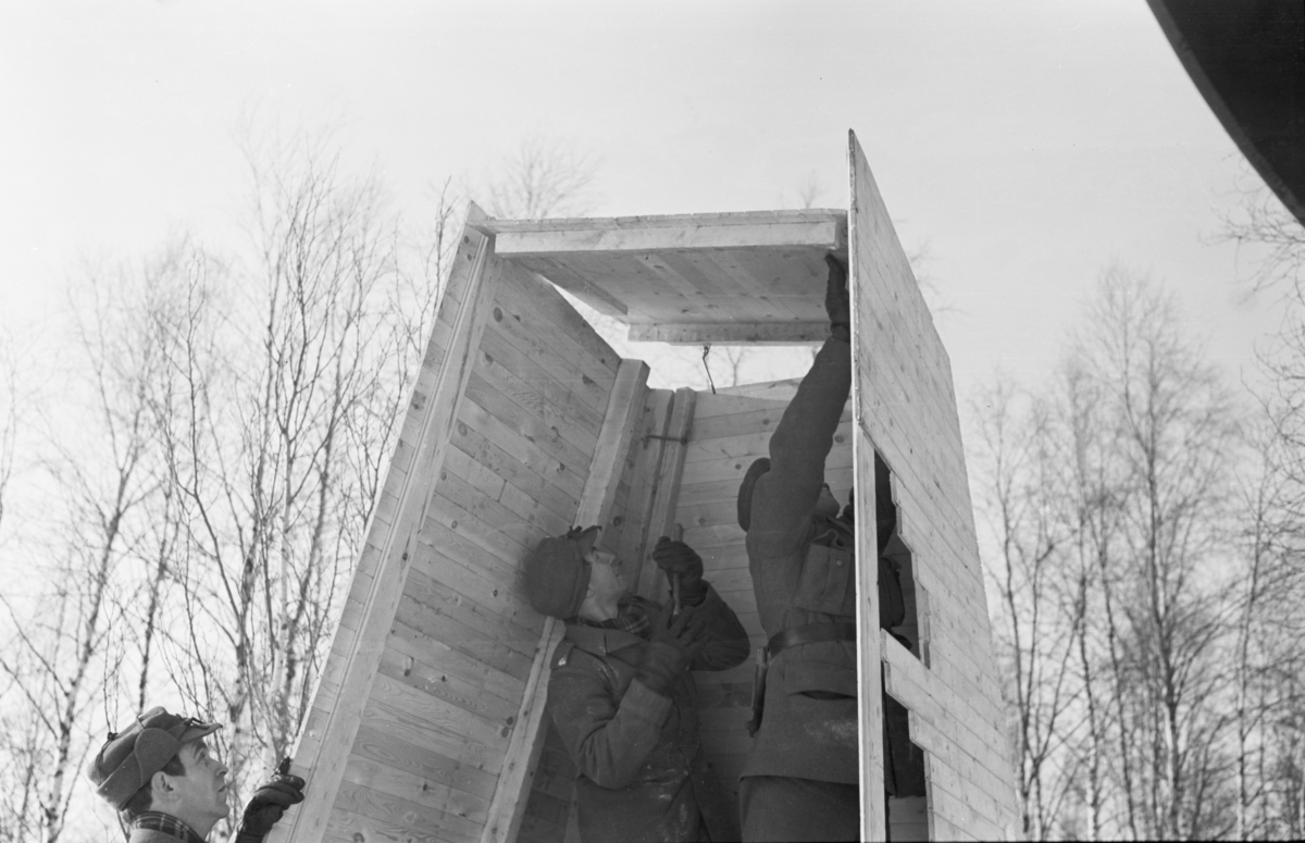 Bygge av skyddshus för flygplansmotor vid F 19, Svenska frivilligkåren i Finland. Tre militärer i arbete.