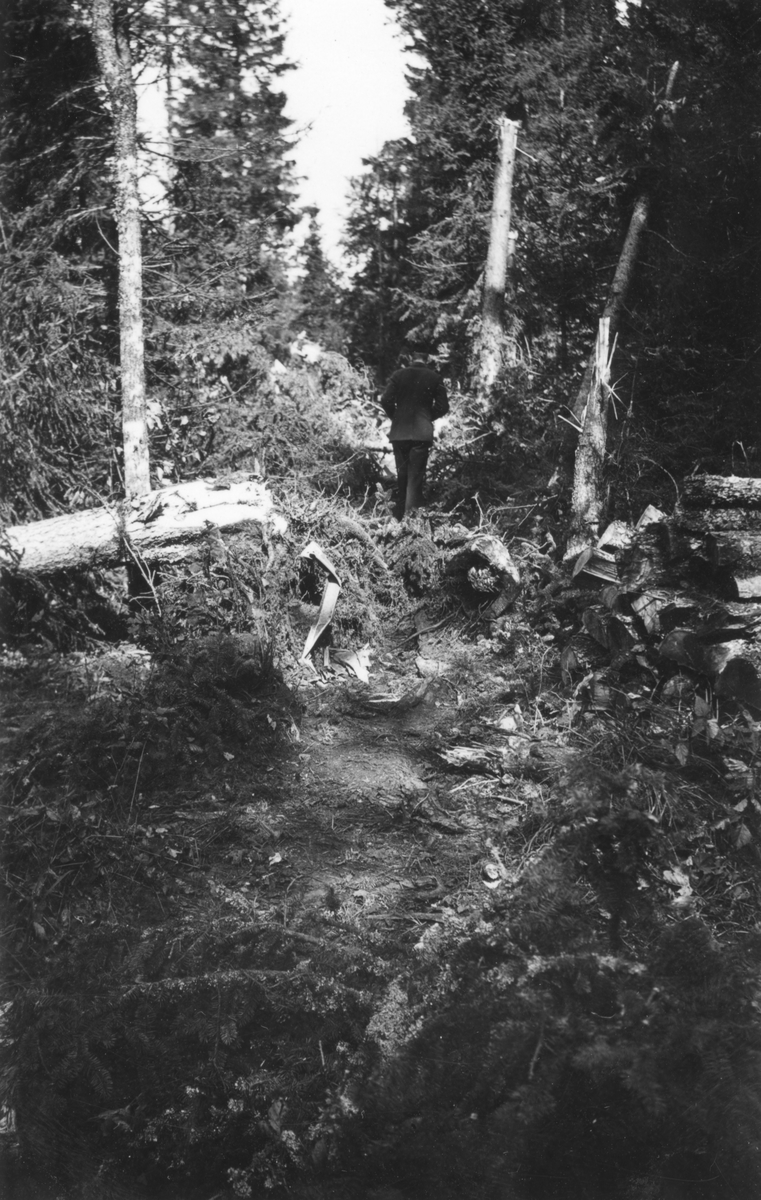 Haveridelar från flygplan B 3 Junkers Ju 86K i skogsparti. Flygplanet har plöjt sig genom träden och skapat en korridor med delar utspridda. En person i uniform ses gående.