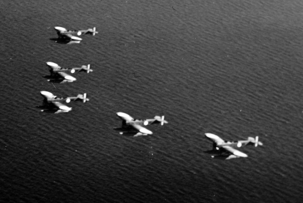 Flygbild av fem flygplan S 5A, Heinkel He 5 Hansa i formation. Vy ovanifrån. 1930-tal.