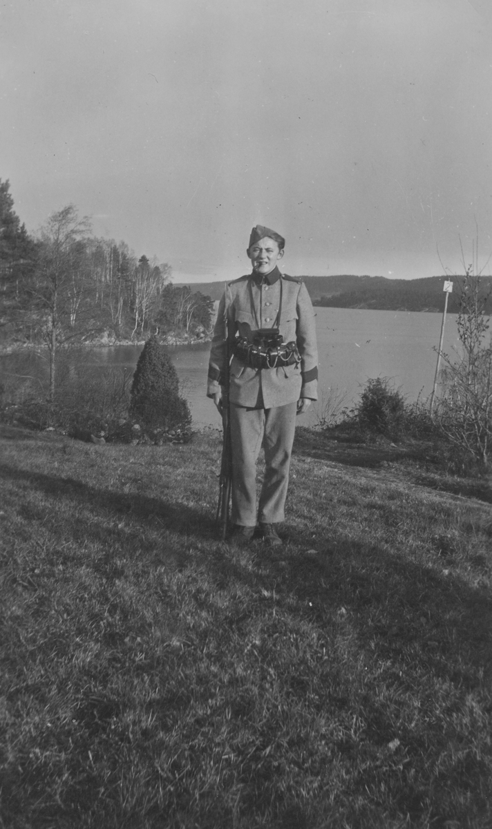 Porträtt av Gunnar Lundin, frivillig luftbevakare under beredskapstiden. I uniform, utomhus vid sjön Stora Le i Dalsland.