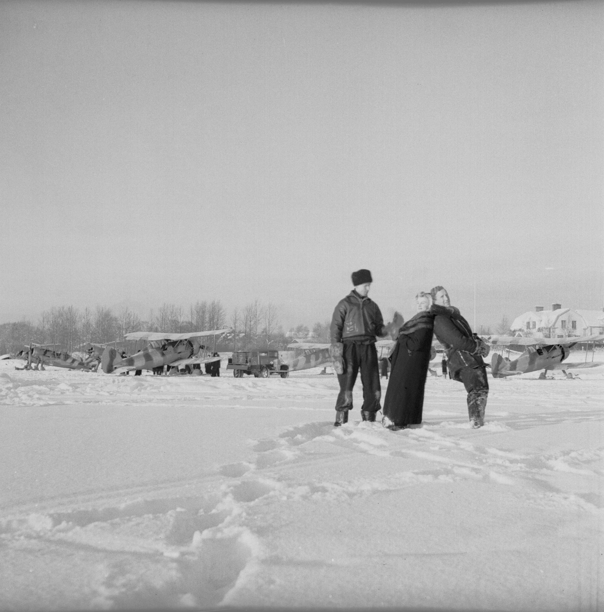 Flygförarna Arne Frykholm samt Åke "Sammy" Nettelbladt-Hollsten samt en kvinna vid namn Maj-Britt står på flygfältet på Kyrksjöns is i Ljusdal den 1 januari 1940. I bakgrunden står sex stycken flygplan Gloster Gladiator. Flygplanen flög senare vidare till Svenska frivilligkåren i Finland, F 19.