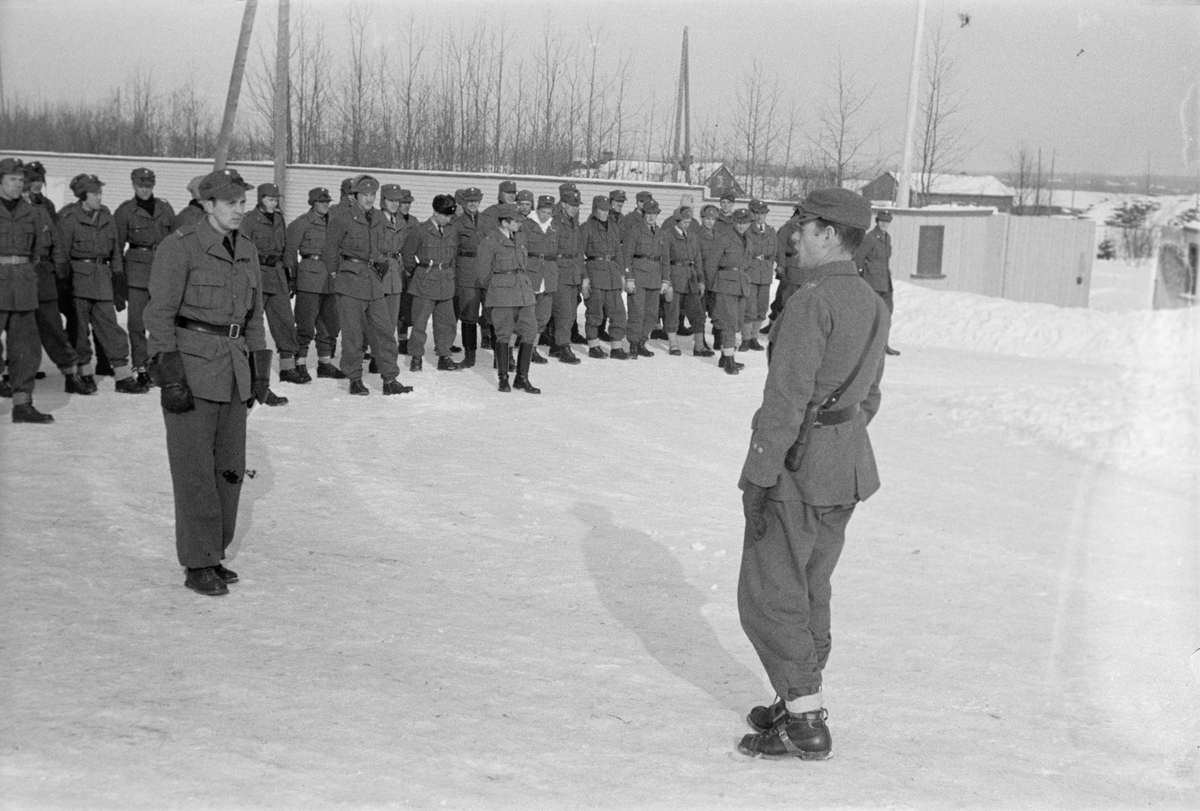 Stabschef Björn Bjuggren talar till markpersonal i Veitsiluoto vid F 19, Svenska frivilligkåren i Finland, den 12 januari 1940.