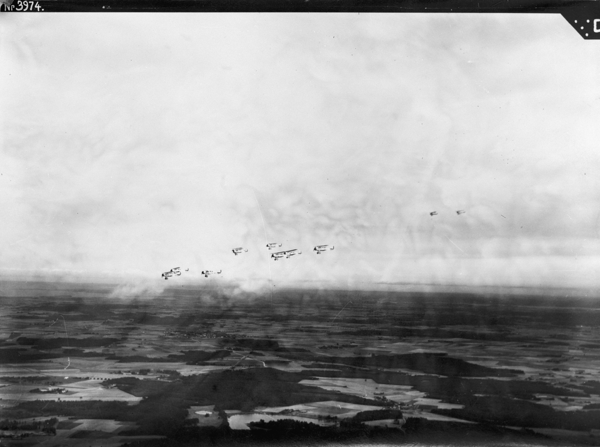Tio militära flygplan S 6 Fokker C.V. flyger i formation över landskap.