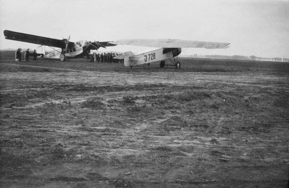 Två civilregistrerade flygplan tillhörande Deutsche Lufthansa står på ett flygfält, slutet på 1920-talet. Folksamling kring flygplanen. Till vänster, Fokker-Grulich F.II med civilregistrering D 1710 och till höger Rohrbach Ro VIII Roland II med civilregistrering D 728.