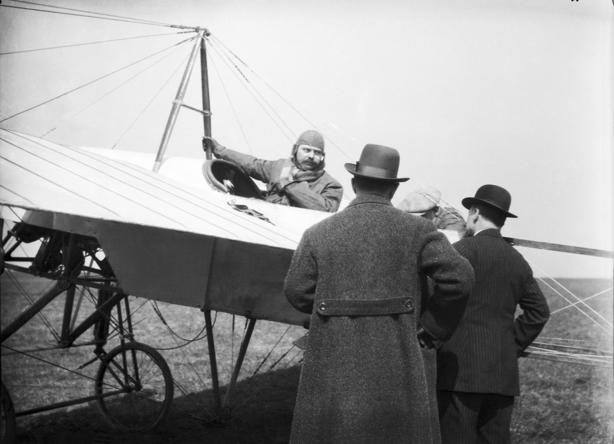 Två flygare i flygplan Bleriox XI. Två män i förgrunden. Vy från sidan.