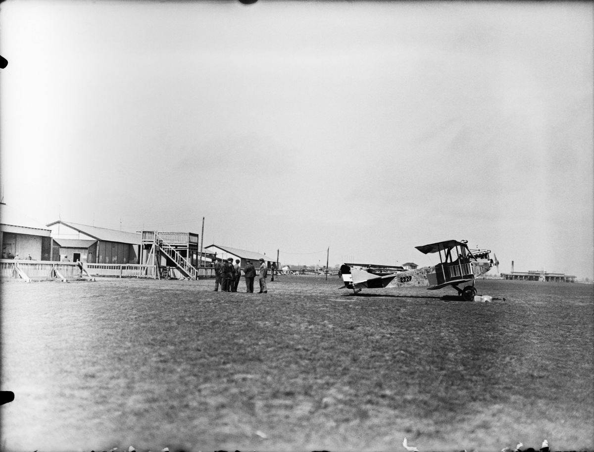 Militära flygfält Wiener-Neustadt i Österrike-Ungern. Flyghangarer, militärer och flygplan Albatros B.I märkt 23.27.