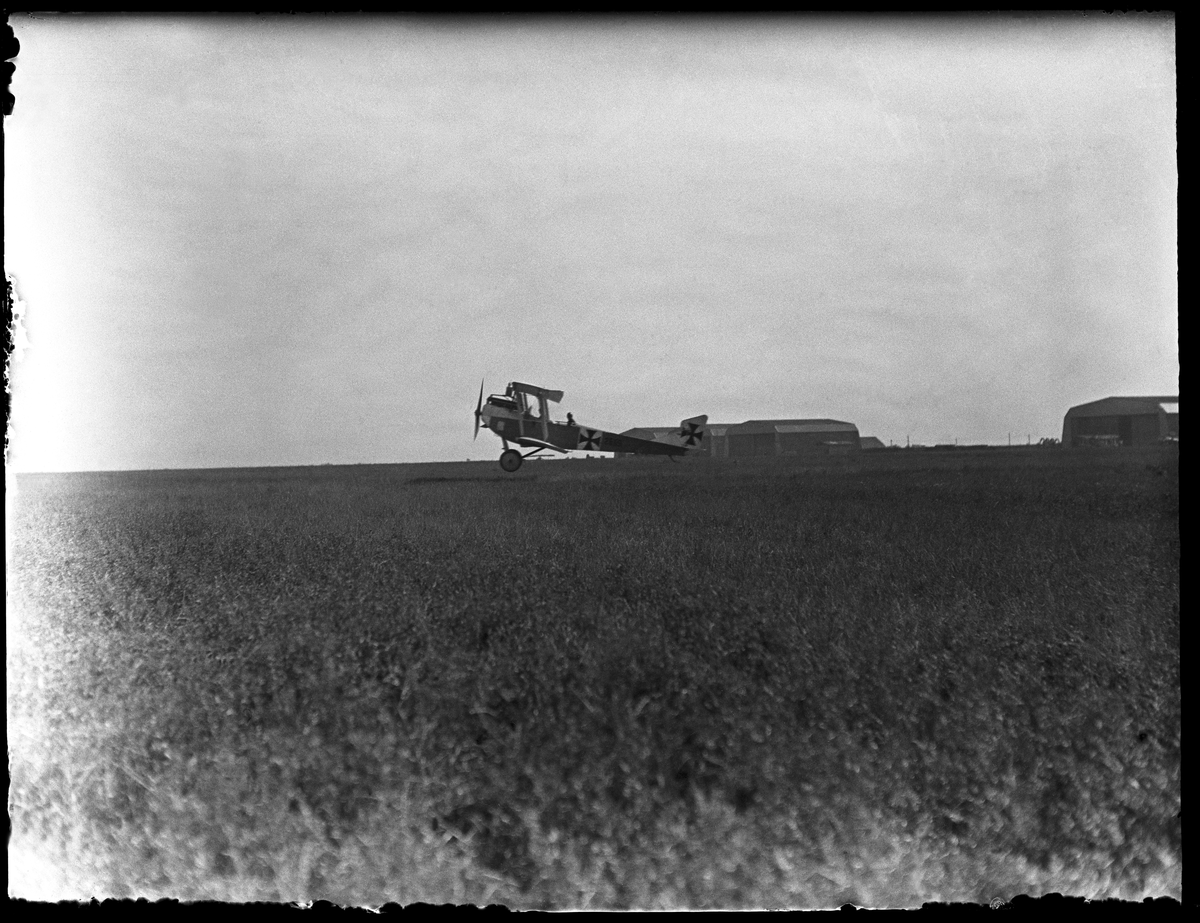 Militärt flygplan Hansa Brandenburg C.I tillhörande Österrike-Ungern startar från flygfält. Byggnader i bakgrunden.