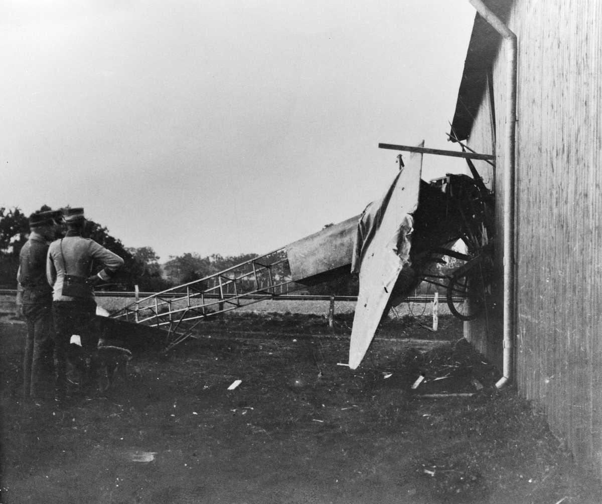 Flygplan Thulin A nummer 9 har flugit rätt på hangarväggen vid Thulins flygskola i Ljungbyhed, den 19 juli 1918. Två militärer inspekterar flygplanet.