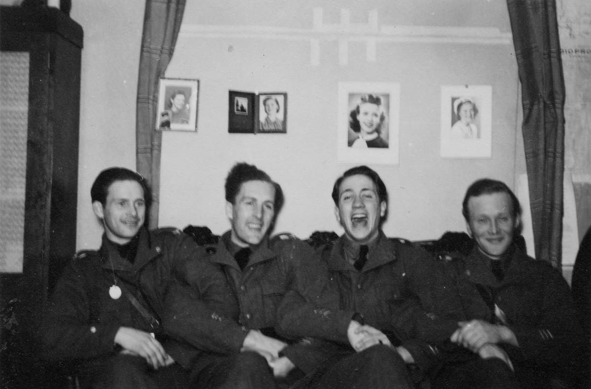 Samkväm på förläggning vid Svenska frivilligkåren i Finland, F 19. Gruppfoto av fyra militärer sittande i en soffa. På väggen bakom finns fyra porträtt av kvinnor uppsatta. Från vänster; Matti Sundsten, Thord Medalen, Roland Sahlberg, Thure Hansson.