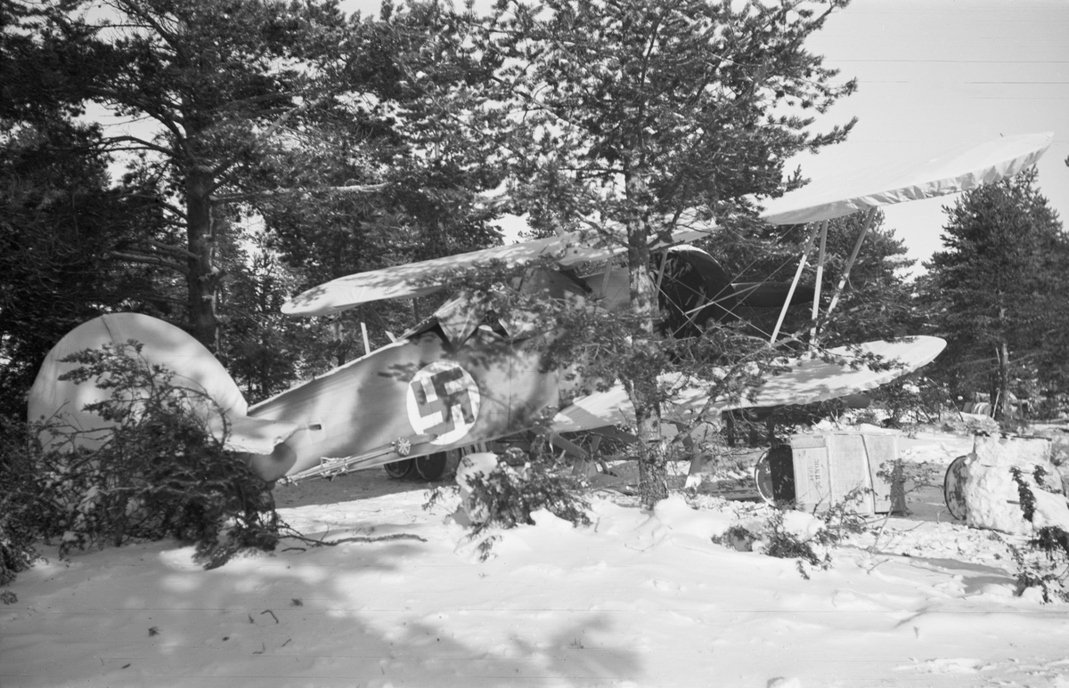 Flygplan Hawker Hart märkt svart M står kamouflerad i flygplanvärn vid Svenska frivilligkåren i Finland, F 19.