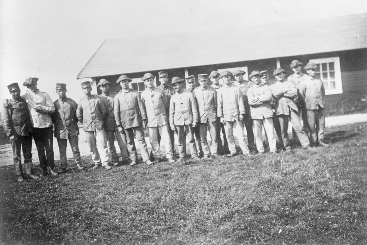 Grupporträtt, personal vid Flygkompaniet på Malmen. Män uppställda framför en byggnad.