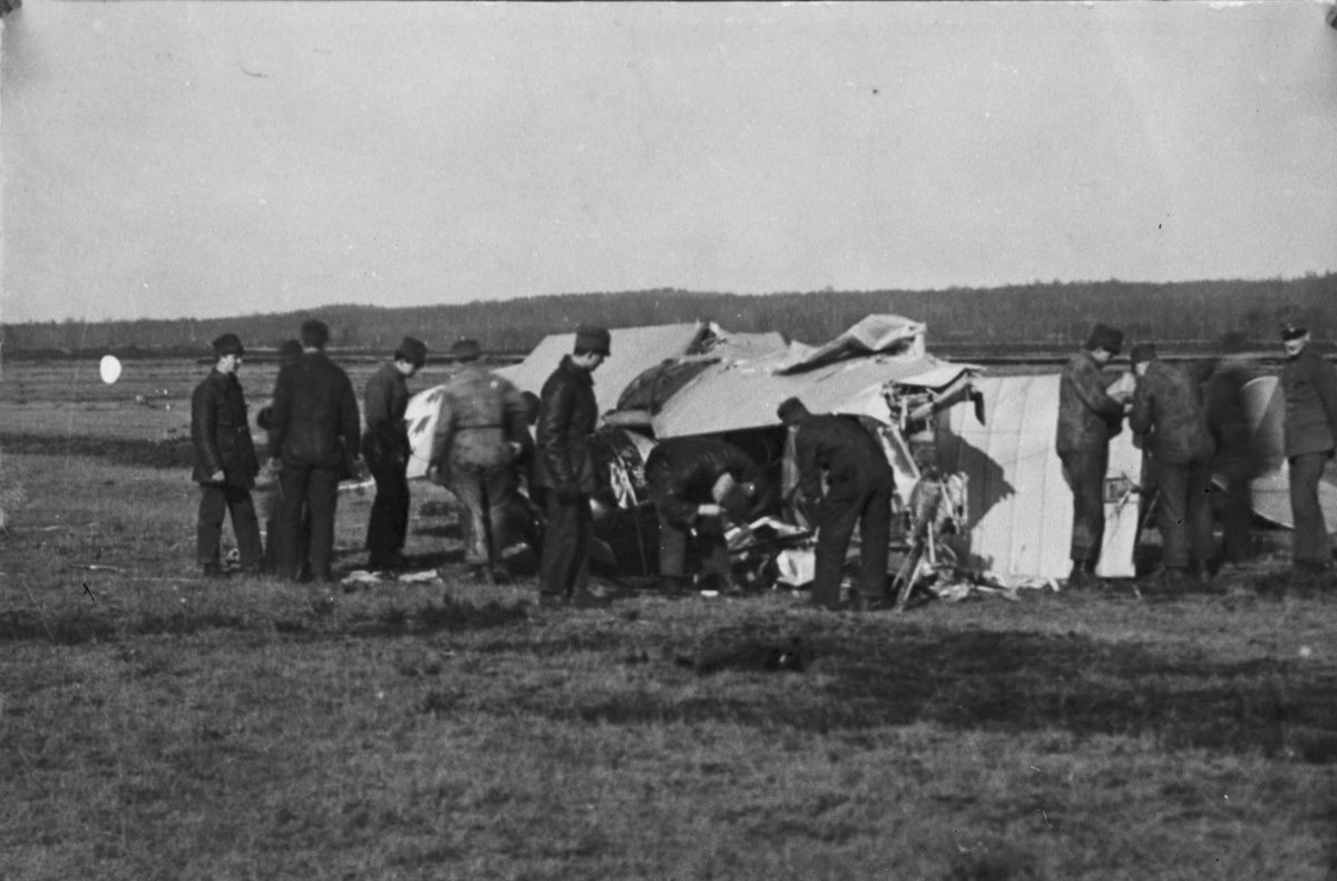 Havererat flygplan Sk 3 Avro 504K nr 075 på flygfältet i Ljungbyhed, 5 mars 1928. En grupp militärer i arbete med flygplanet.