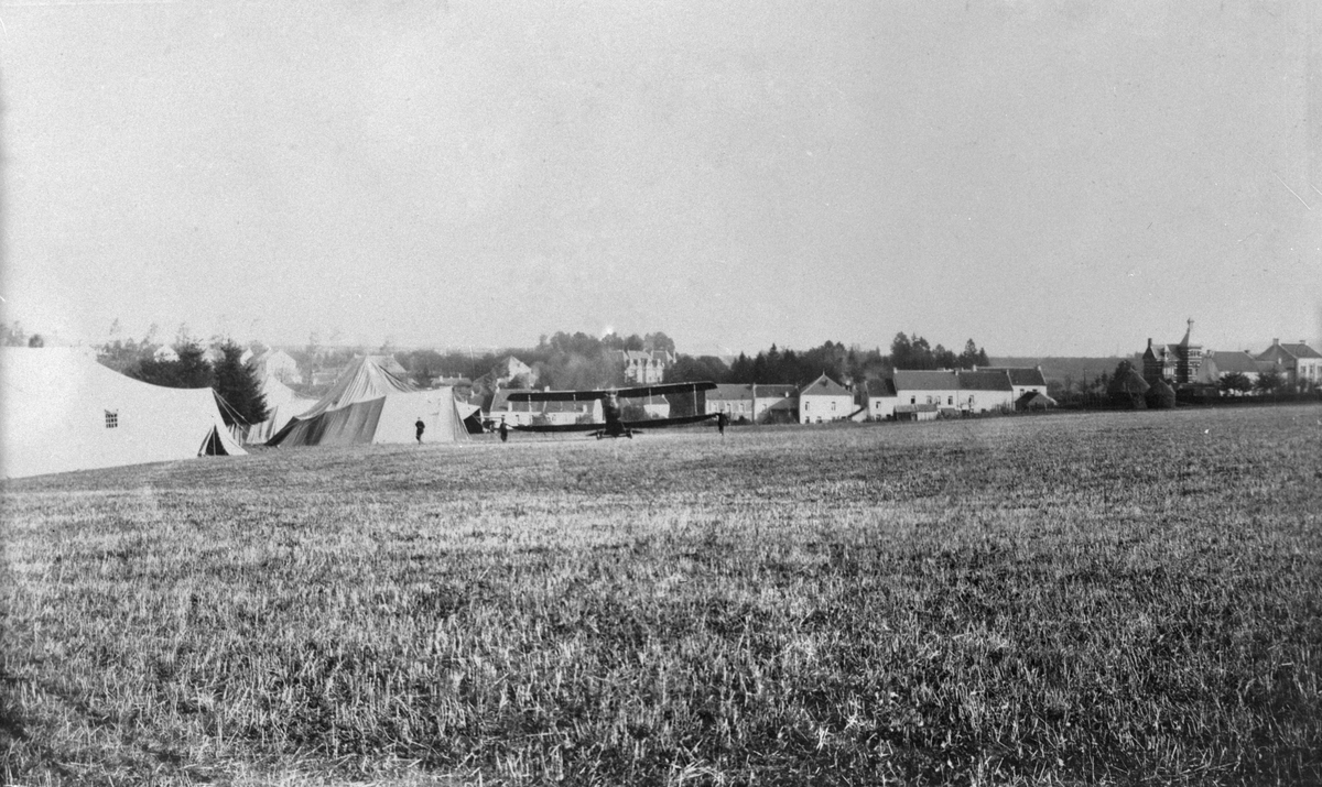 Flygfält och tälthangarer vid tillfällig bas vid regemente, 1920-tal. Flygplan Albatros uppstält på fältet