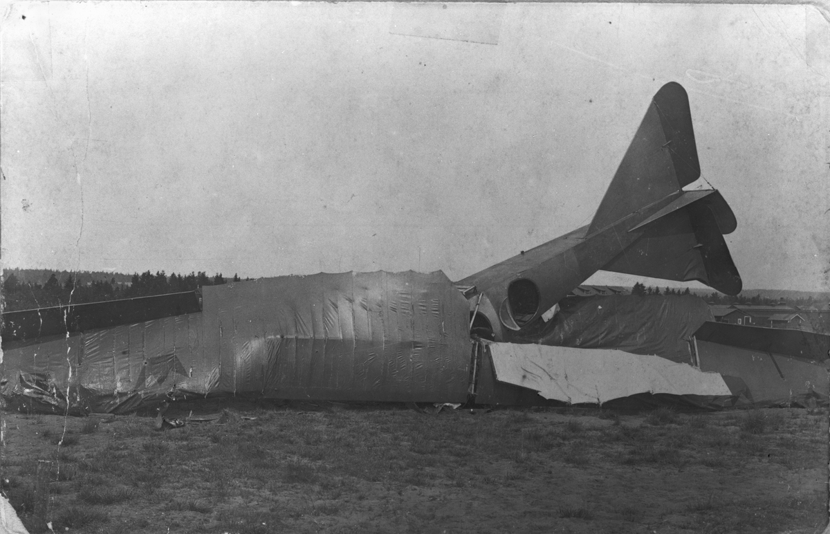 Havererat flygplan Albatros nr 16 i Skillingaryd efter störtning den 15 juni 1917. Vy framifrån.