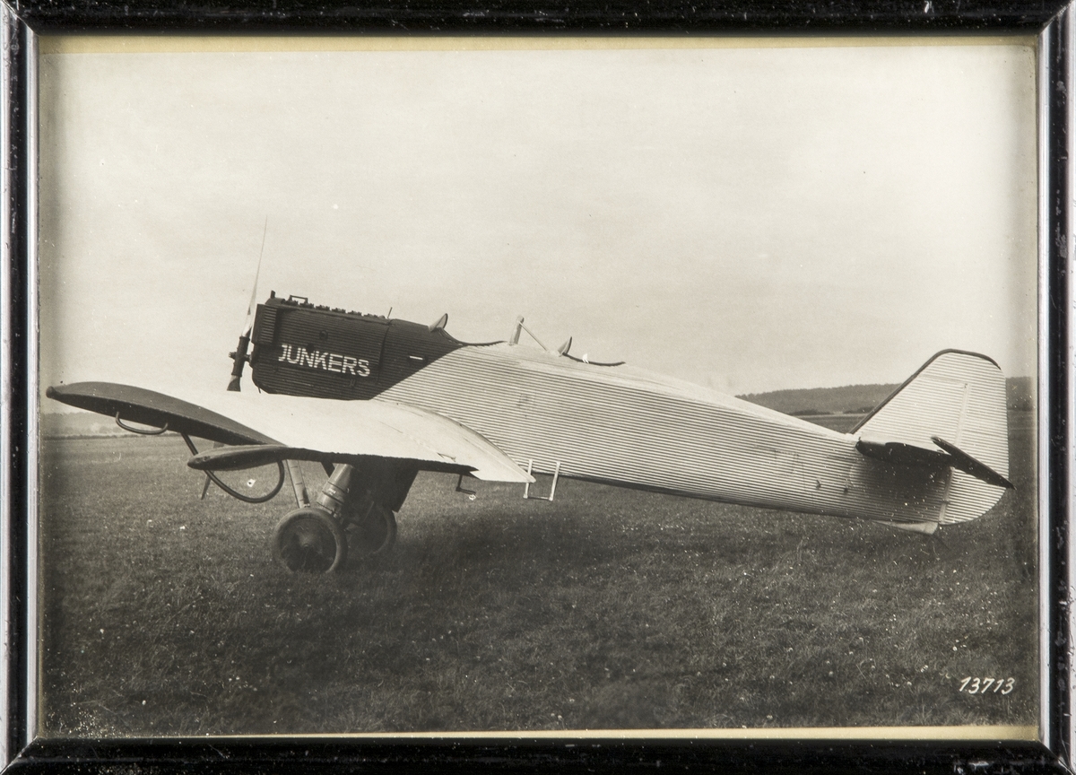 Ett civilt flygplan tillverkat av Junkers står på ett flygfält. Inramat foto.