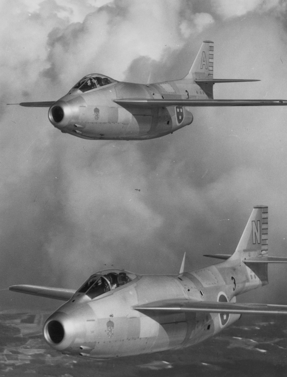 Två stycken flygplan J 29 tillhörande F 3 Malmen flyger i rote. Vy snett framifrån.