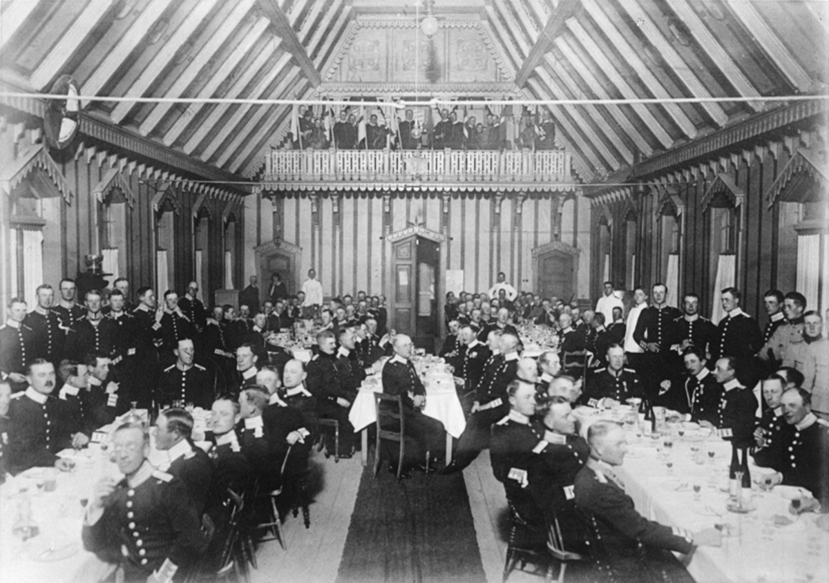 Måltid i officersmässen vid kung Oscar II:s besök på Malmen. Officerare sittandes vid långbord.